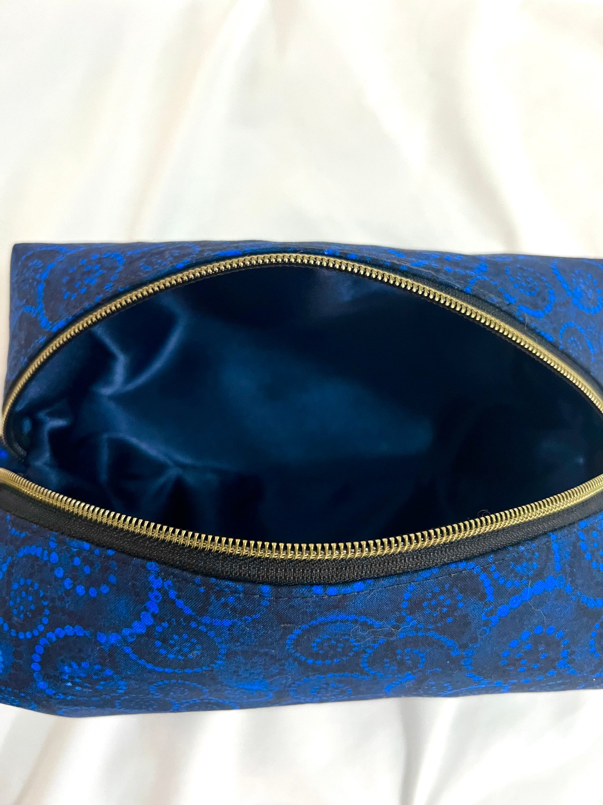 Intelligent and Sophisticated. This blue tech bag can help you organize all your past, present, and future iPhone connectors, Chinese fitness watches, rechargeable flashlights, wire connectors, chip pullers, alarm clocks, Leather Honey, and can of Boeshield T-9 lubricant. But keep your phone in a drawer. A must for your cranky geek. Finished with a bright gold zipper with two tabs and a rich navy satin lining.